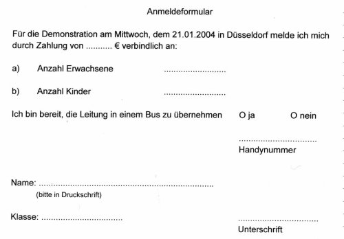 SchülerInnen und LehrerInnen unserer Schule Großdemonstration am Mittwoch, dem 21.01.2004, 12:00 Uhr, vor dem Landtag in Düsseldorf Liebe Eltern, liebe Schüler/innen, liebe Lehrer/innen, nach dem großen Erfolg unserer Unterschriftenaktion im Erzbistum Köln findet nun zum obigen Termin eine landesweite Großdemonstration gegen die geplanten Kürzungen der staatlichen Mittel für die Freien Schulen in NRW statt, an der alle Schulen in freier Trägerschaft aus ganz Nordrhein-Westfalen teilnehmen. Dazu folgende Informationen: Teilnehmer der Demonstration sind Eltern, Lehrer und Schüler ab Jahrgangsstufe 9. Jüngere Schüler nur in Begleitung ihrer Eltern. Die Anmeldung erfolgt an Hand des beigefügten Anmeldebogens bis spätestens 18.12.2003 im Schulsekretariat. Wir fahren mit Bussen. Abfahrt: ........... Uhr Parkplatz .......................... Ankunft: voraussichtlich ................ Uhr Beginn der Demonstration: 12.00 Uhr. Die frühe Anreise ist wegen des Fußweges vom Busparkplatz zum Landtag von ca. 3,5 km erforderlich. Die Fahrtkosten tragen die Eltern/Lehrer/Schüler selber. Es muss mit einem Kostenbeitrag von .....Euro pro Person gerechnet werden, den Sie bitte bei der Anmeldung im Schulsekretariat entrichten. (Natürlich können Sie auch privat mit dem PKW nach Düsseldorf kommen.) Transparente usw. werden von den Schulen erstellt. In jedem Bus muss ein Leiter zur Verfügung stehen, der per Handy zu erreichen ist. Wer von Ihnen bereit ist, diese Aufgabe zu übernehmen, vermerke dies bitte auf dem Anmeldeformular. Das Erzbistum wird einen Flyer zu dem Thema erstellen. Die dortigen Informationen können Sie in Diskussionen oder für Antwortschreiben an die Landtagsabgeordneten verwenden. Außerdem erstellt der Aktionskreis ein Thesenpapier, das vor der Demo verteilt wird. Weitere Informationen unter www.stursulabruehl.de/EFG-INFO. Im Interesse unserer Kinder bitte ich um rege Teilnahme an der Demopnstration. Denn: Nur gemeinsam sind wir stark! Mit freundlichen Grüßen